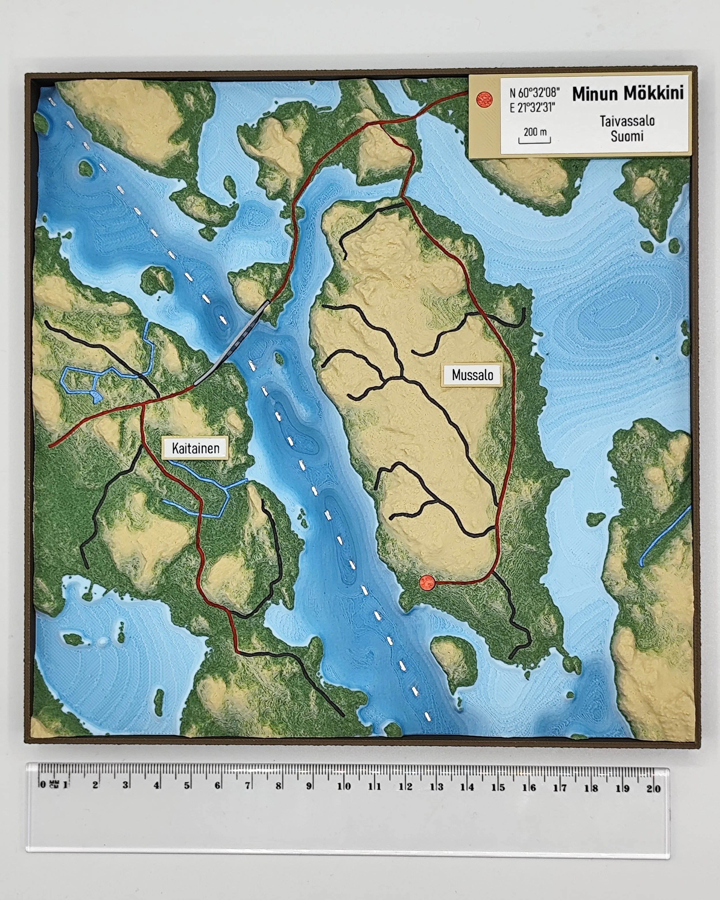 - Asphalt and gravel roads together with rivers and ferry routes are manually painted onto the map with different colors